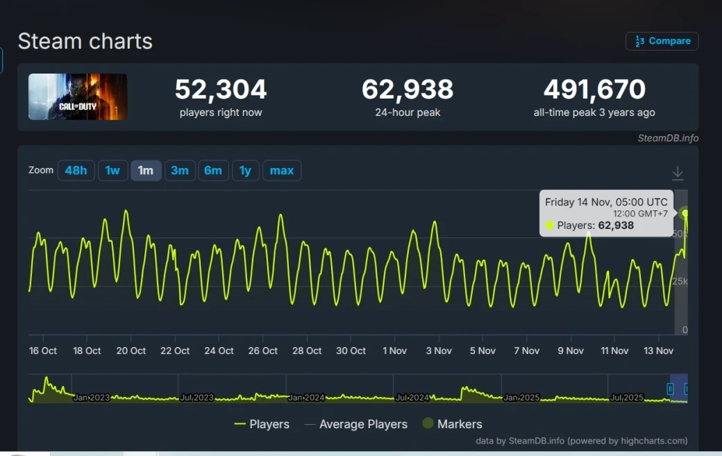 Что до онлайна, то, согласно SteamDB, общая аудитория Call of Duty не особо выросла после релиза новинки. Суточный пик онлайна поднялся до 62 938 игроков одновременно., а на момент написания не превышает и 53 тыс.