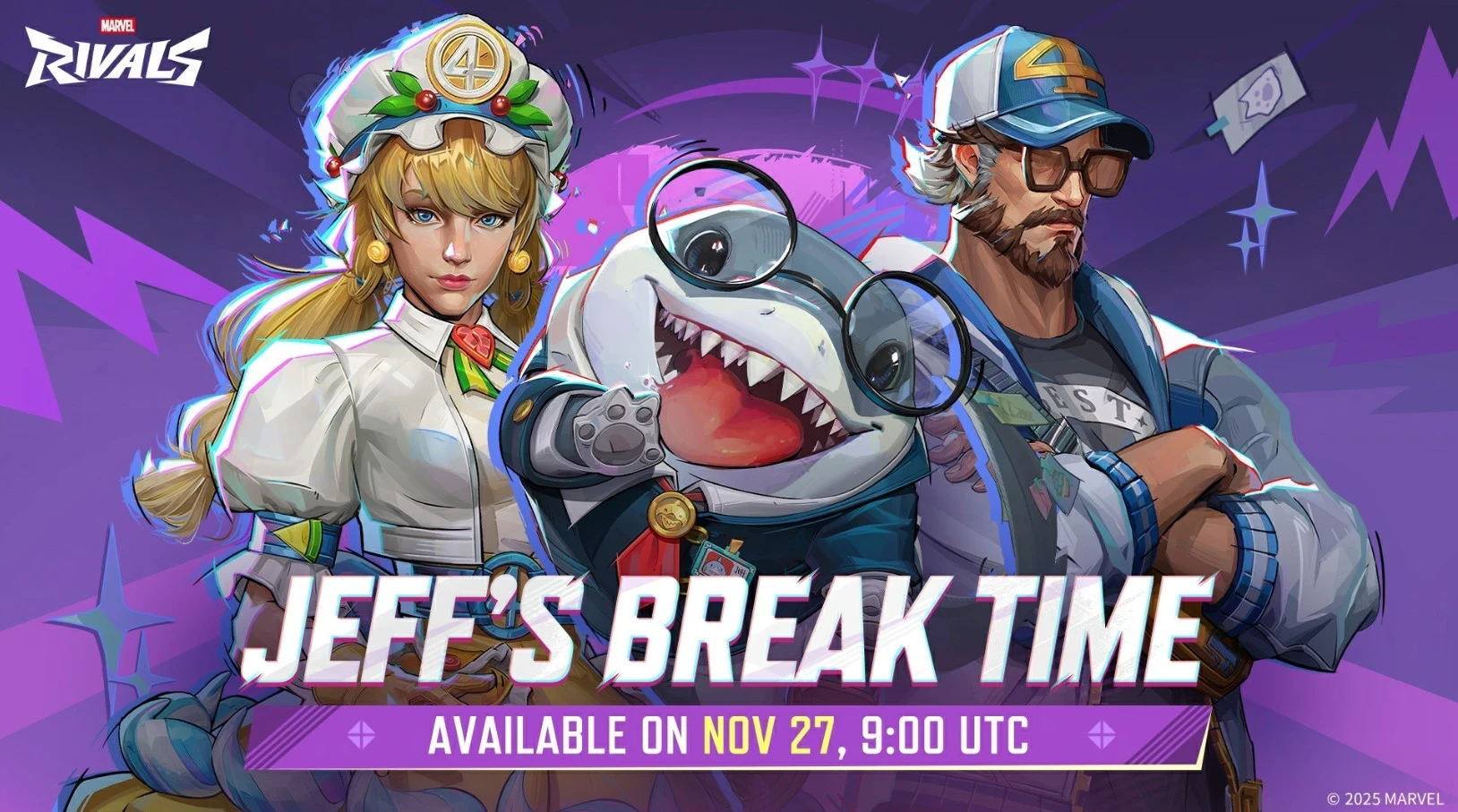 Естественно, без новеньких костюмов обновление не обошлось. Они находятся в мини-вариации боевого пропуска под названием Jeff’s Break Time. Среди бесплатных костюмов есть наряд для акулёнка Джеффа. А в премиальной версии находятся костюмы для Невидимой леди и Мистера Фантастика. Также в магазине можно купить «конфетный» наряд Венома.