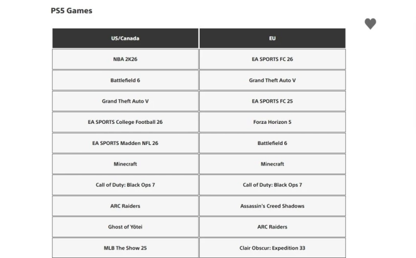 В целом же лидеры в регионах довольно ожидаемые: спортивные симуляторы, гонки, Minecraft, Grand Theft Auto V и новинки популярных серий шутеров — Battlefield 6 и Call of Duty: Black Ops 7.