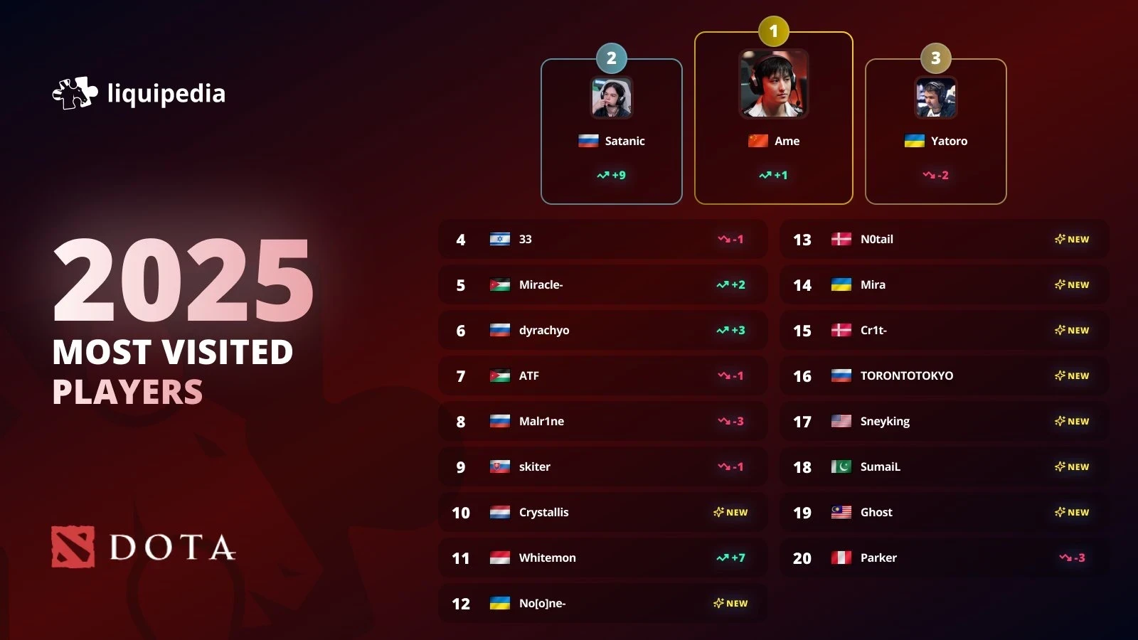 Ame обошел Yatoro в Dota 2 и стал самым популярным игроком 2025 года на Liquipedia